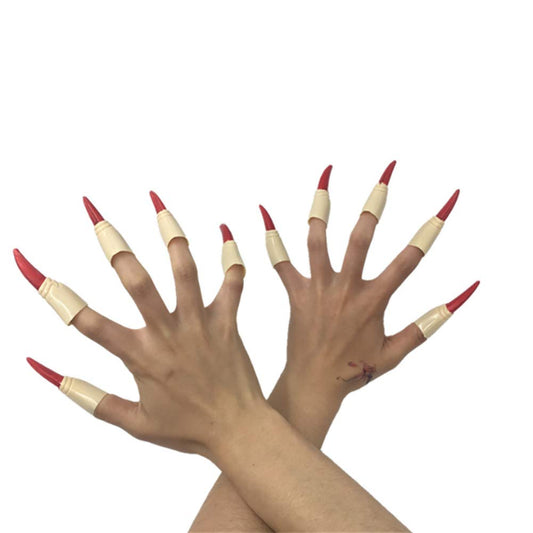 Arjoos | Zombie Witch Fake Nails Cover with 2 teeth's - ( RED Nails ) | Fake Finger Claw Witch Nails Scary , Halloween Nail Finger Tips Creepy , Witch Fingers Long Nails | Halloween Party Supplies ( 5 Nails In a Pack )