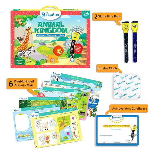 Arjoos | Skillmatics Educational Game - Animal Kingdom | Reusable Activity Mats with 2 Dry Erase Markers | Gifts for Ages 3 to 6 | Multicolour | Both Boys and Girls