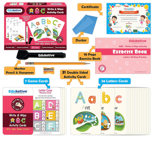 Arjoos | Eduketive - ABC Letters Write & Wipe Reusable Activity Cards | Writing Practice & Preschool Learning Educational Game with Exercise Book | Ages ( 3-6 yrs )