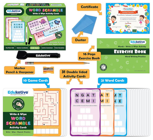 Arjoos | Eduketive - Word Scramble Write & Wipe Reusable Activity Cards | Writing Practice & Preschool Learning Educational Game with Exercise Book | Ages ( 3-9 yrs )