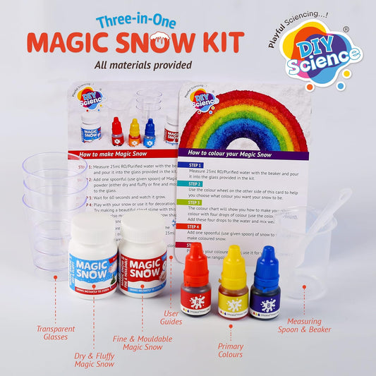 Arjoos | Magic Snow Kit (3-in-1) | 950+ Foil Sticker | Instant Snow, Magically Grows to 2500% | Dry & Fluffy, Fine & Mouldable, Colourful Snow 12+ Colours, Make Snowman, Christmas Decoration | Birthday Gift For Kids - Ages - 3+ ( Safe for Kids )